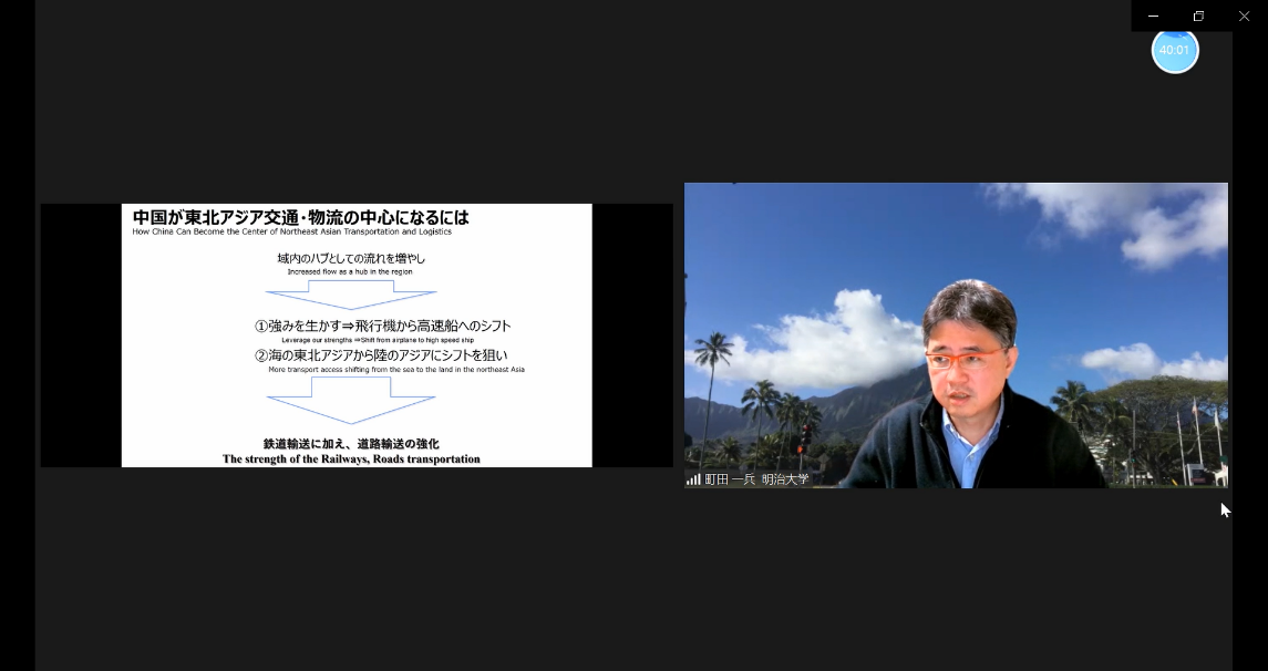 On December 1st, 2022, Professor MACHIDA IPPEI from the Department of Commerce of Meiji University, Japan, delivered an online lecture on "Transportation and Logistics in Northeast Asia" at the invitation of the Northeast Asian Research Center of Jilin University, the Northeast Asian Studies College of Jilin University, the Institute of Japanese Studies of Jilin University, and the Special Committee for Northeast Asian Regional Studies, Academic Association for International Cultural Exchange. The lecture was moderated by Associate Professor Li Hongmei, Deputy Director of the Institute of World Economics, Northeast Asian Studies College of Jilin University.