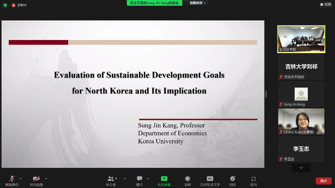 On November 18th, 2022, the lecture "Evaluation of Sustainable Development Goals for North Korea and Its Implication" of the High-End Symposium on Northeast Asia International and Regional Studies was successfully held at Jilin University. The lecture was jointly organized by the Northeast Asian Research Center of Jilin University, the Northeast Asian Studies College of Jilin University, and the Special Committee for Northeast Asian Regional Studies, Academic Association for International Cultural Exchange. The College of Northeast Asian Studies invited Professor KANG Sung Jin in the Department of Economics of Korea University, to deliver the lecture. Professor Xuan Chunji of the Northeast Asian Studies College of Jilin University hosted the lecture. At the beginning of the lecture, Professor Xuan Chunji, on behalf of Prof. Wu Hao, Dean of the Northeast Asian Studies College of Jilin University, extended a warm welcome and high appreciation to Professor KANG Sung Jin.