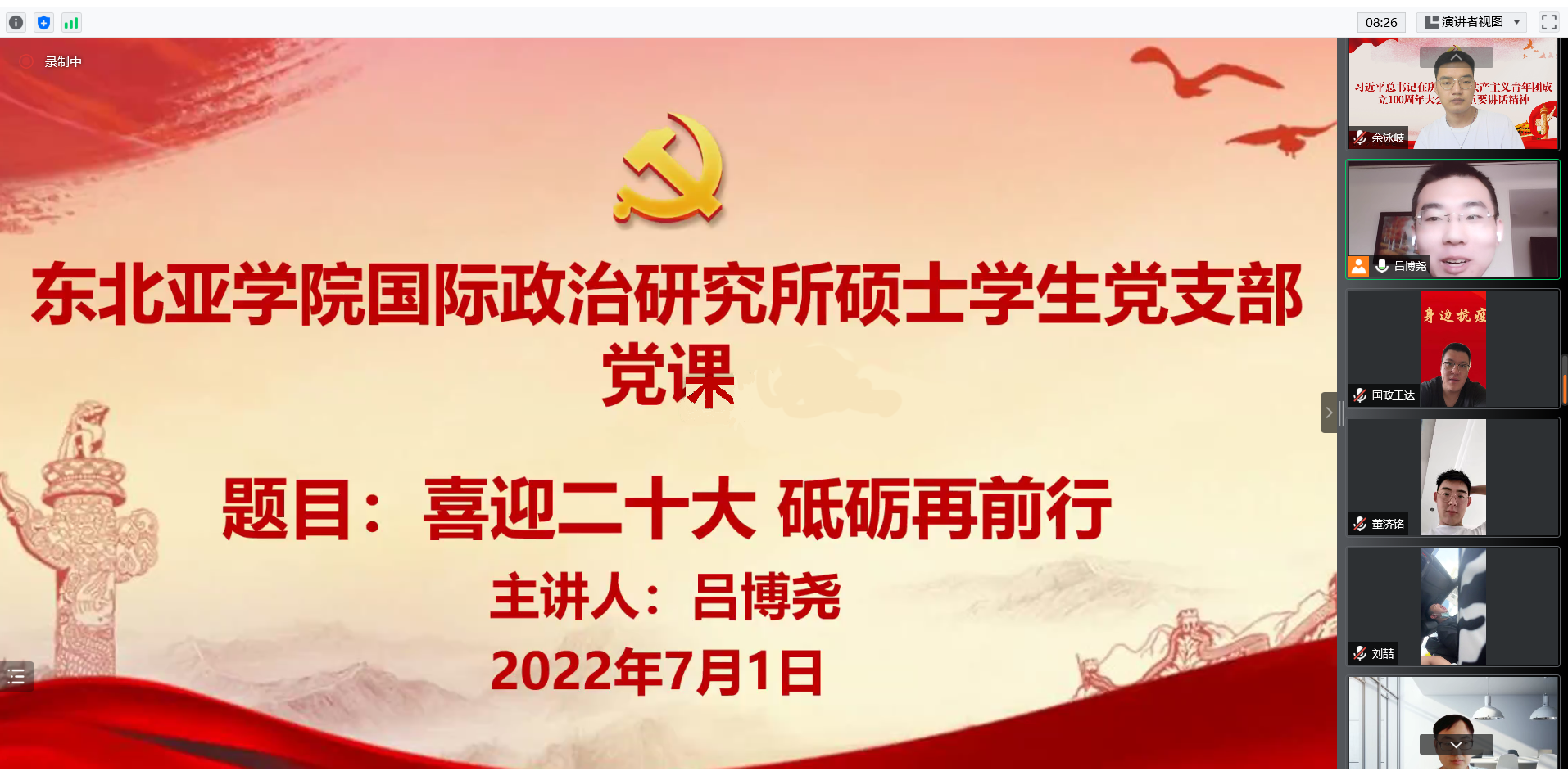 党委硕士学生党支部集中开展了“党课开讲啦”活动,组织全体硕士学生党员开展了理论学习和研讨,支部书记带头讲党课,引导广大党员深刻领悟习近平新时代中国特色社会主义思想和党的十九届历次全会精神,重温党的光辉历程,激励广大党员砥砺深耕、勇毅笃行,全心全意为党和人民服务,以实际行动迎接党的二十大的胜利到来。