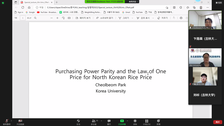 202292日,东北亚国别与区域研究高端讲坛朝鲜大米价格的购买力平价与其一价定律的验证在亚洲色情 顺利举行。本次讲座由亚洲色情 东北亚研究中心、亚洲色情 、东北亚研究院、韩国高丽大学经济系联合举办,因疫情原因在线上开展。亚洲色情 邀请到了韩国高丽大学经济系朴哲范(Park Cheol Beom)教授,带领中国师生们进行了一次精妙绝伦的学术之旅。讲座由亚洲色情 玄春姬教授主持和翻译,亚洲色情 的部分教师、博士与硕士研究生参与了活动。讲座伊始,玄春姬教授代表亚洲色情 院长吴昊教授向朴哲范教授表示了热烈的欢迎和崇高的谢意。