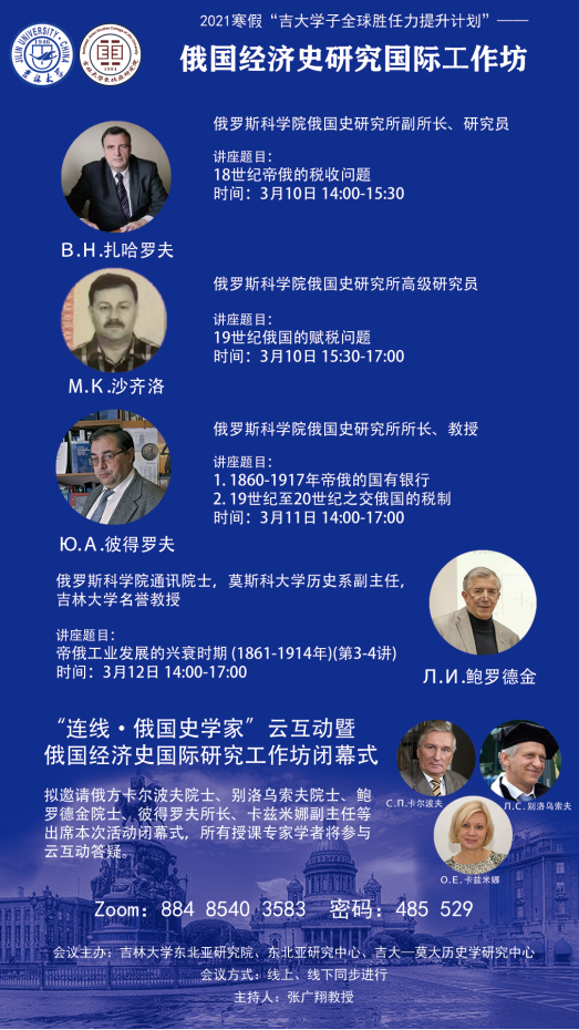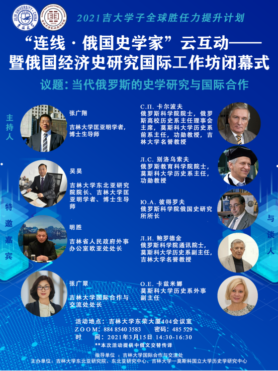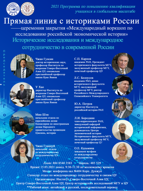 国际合作与交流处全程指导,在线上、线下同时开展。来自国内多所兄弟院校和科研机构的专家学者,以及莫斯科国立大学和俄罗斯科学院的С.П.卡尔波夫院士、Л.С.别洛乌索夫院士、Л.И.鲍罗德金通讯院士、Ю.А.彼得罗夫教授等10余位俄罗斯史学界顶尖学者齐聚云端,共筑庠序,为吉大学子带来了一场场精彩纷呈的史学盛宴,同时深度研讨并展望了中俄两国在俄国史领域的合作成效与发展前景。国际工作坊系列活动历时两周,于3月15日圆满闭幕。