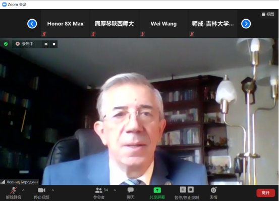 С.П.卡尔波夫院士在致辞中肯定了吉大、莫大在俄国史研究及俄中交流中取得的成就,高度评价了张广翔教授团队译介的《俄国史译丛》,并衷心祝愿张广翔教授领导的这一支俄国史学派能够培养出更多有为的青年学者。他还提出,今年是中国共产党建党100周年,中俄两国都应重视共产党的党史。研究两国两党之间的关系,有利于加深两国及两国人民的相互理解。