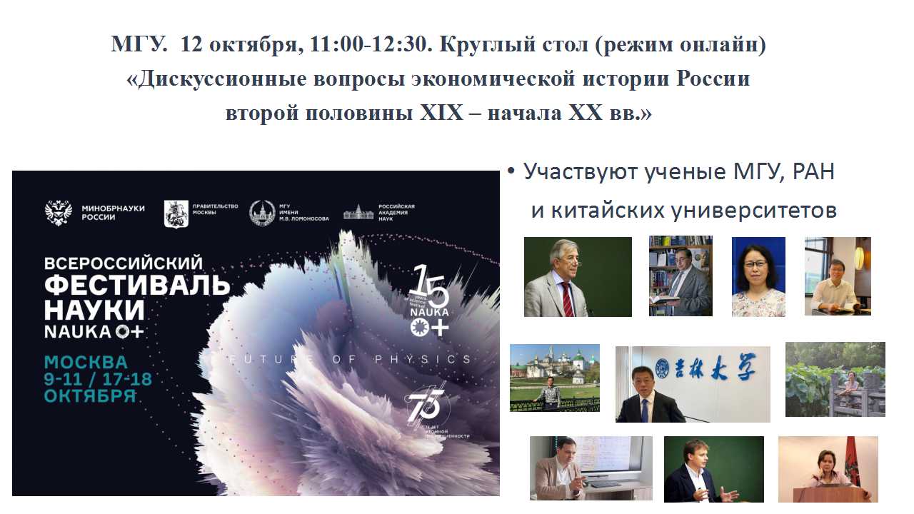 2020年1012日下午,第十五届全俄学术节(莫斯科)框架下的首场圆桌论坛“19世纪下半叶-20世纪初俄国经济史研究中的争议问题”在莫斯科大学隆重召开。来自莫斯科国立大学、俄罗斯科学院、中国四所高校和科研机构的近百名专家学者、学生齐聚云端。本次活动由莫斯科大学主办,亚洲色情 东北亚研究院张广翔教授应邀作为圆桌论坛的中方召集人参加会议并做了主旨发言。来自莫斯科国立大学和俄罗斯科学院的列昂尼德·鲍罗德金院士、尤里·彼得罗夫所长、索菲亚·萨罗玛季娜、季木尔·瓦列托夫、安德烈·瓦罗德津教授,以及来自中国亚洲色情 、复旦大学、中国社会科学院、内蒙古师范大学的王晓菊、王学礼、李振文、袁丽丽等10位学者共同就俄国经济史研究中的争议问题展开了热烈讨论。