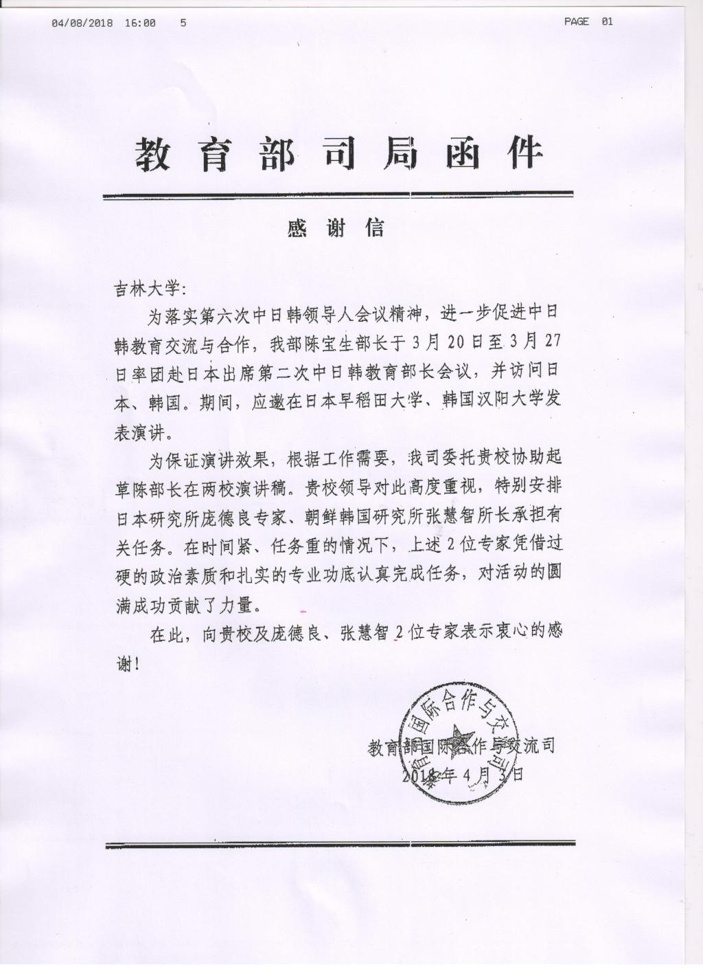 近日教育部国际合作与交流司致信亚洲色情 ,对东北亚研究院庞德良教授和张慧智教授表示感谢。