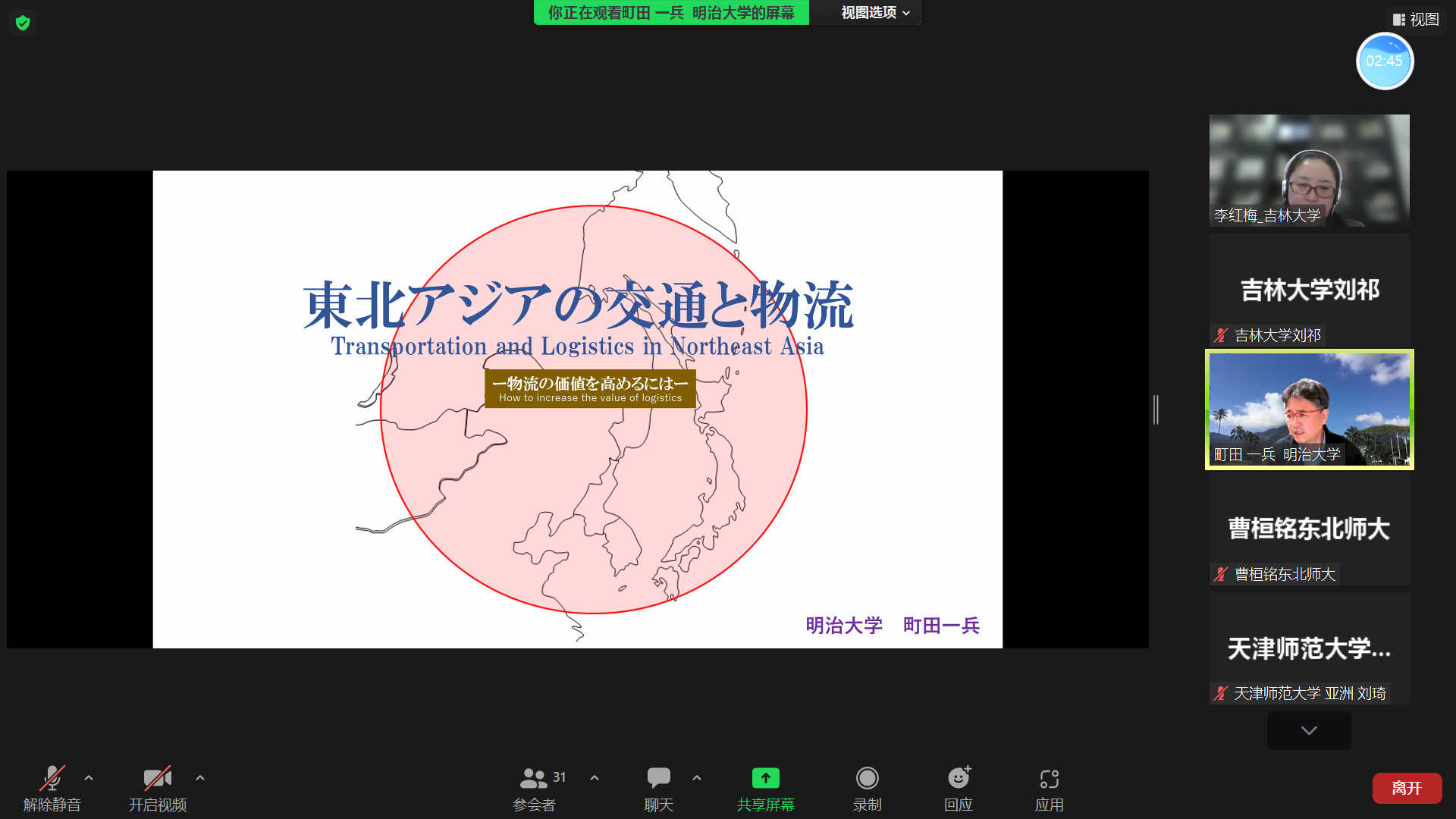 日本研究所、国际文化交流学术联盟东北亚区域研究专门委员会的邀请,日本明治大学商学部町田一兵(MACHIDA IPPEI)教授举行了以“东北亚交通与物流”为主题的线上讲座。本次讲座由亚洲色情