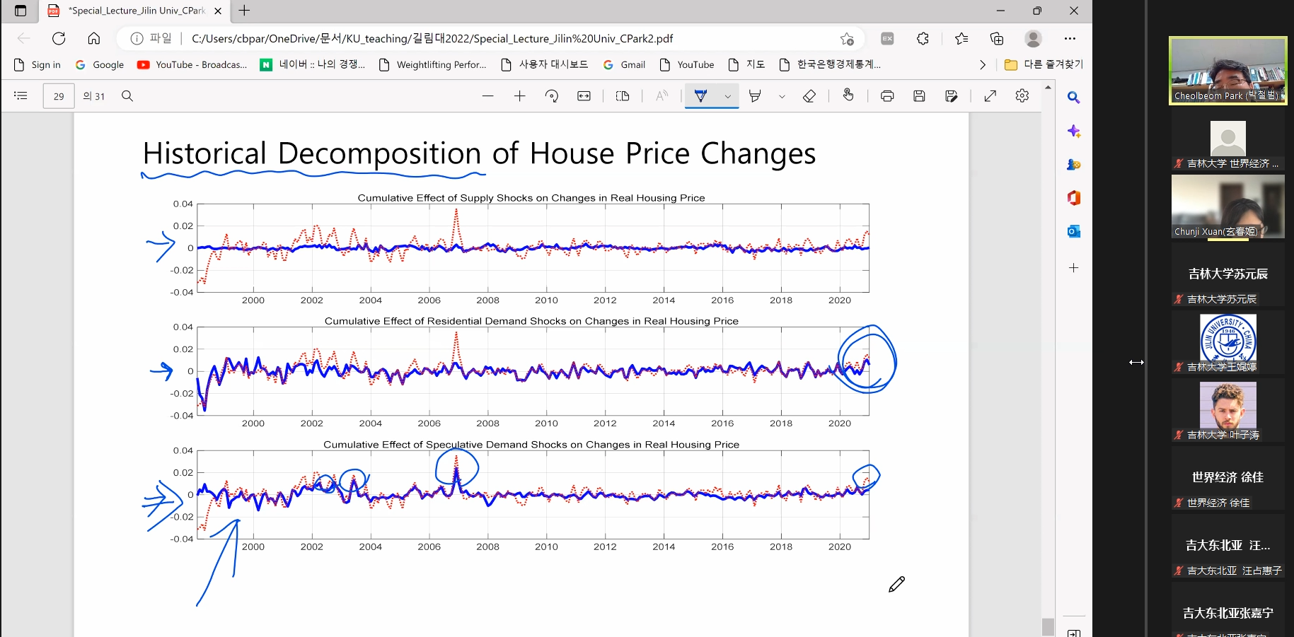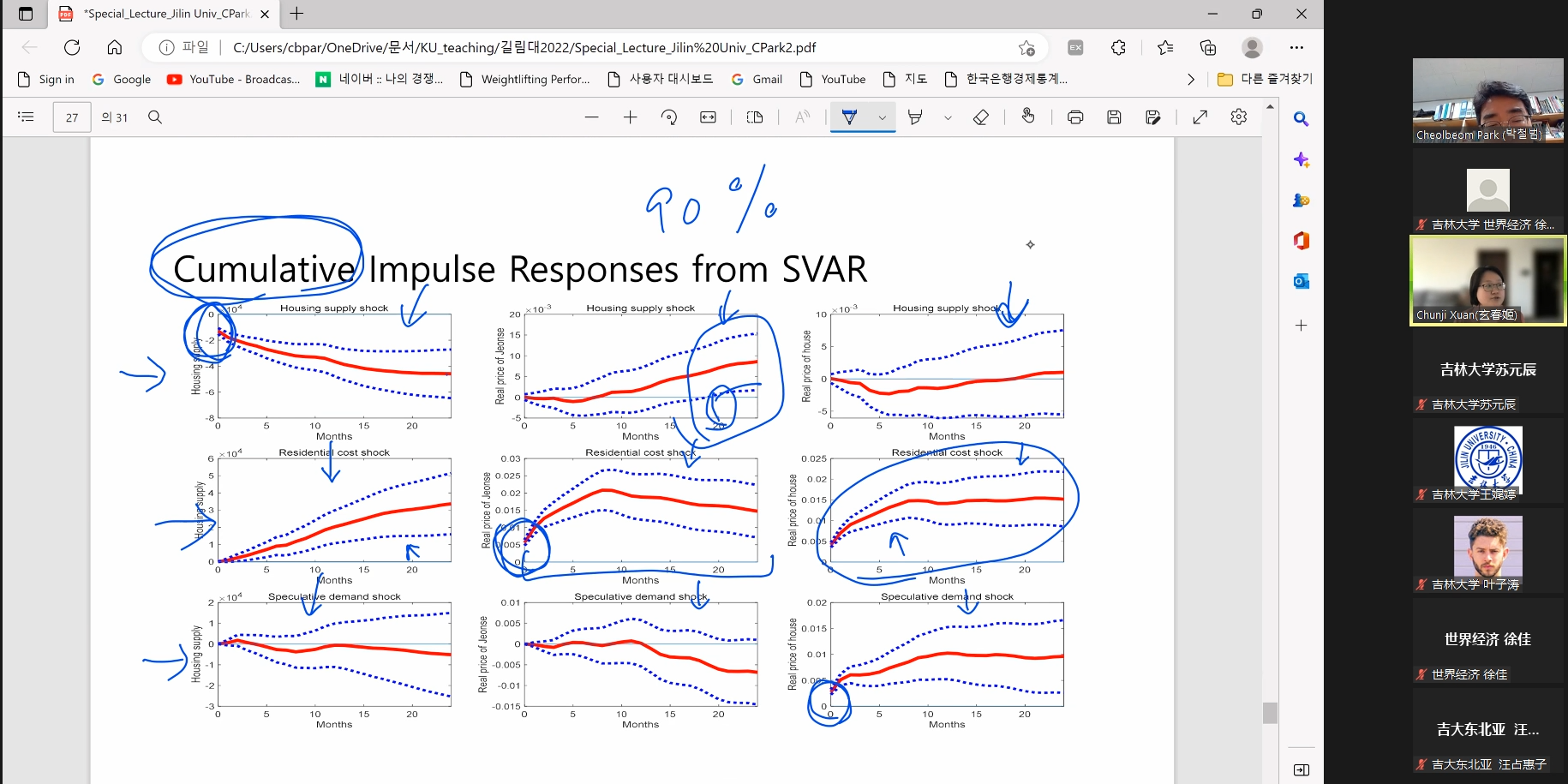 讲座第一部分朴教授详细介绍了结构向量自回归模型(SVAR)、短期制约条件下的SVAR模型、长期制约条件下的SVAR模型、符号限制条件下的SVAR模型、基于冲击限制条件下的SVAR模型。讲座第二部分朴教授介绍了韩国权税制度及其对韩国房地产市场的影响。讲座第三部分朴教授介绍了利用SVAR模型对韩国房地产市场进行实证研究分析的过程。最后朴教授根据研究结果从供给冲击、实际需求、投机需求三个方面解释韩国房地产市场近期的发展变化。