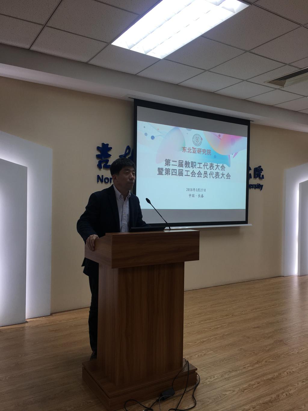 2018年3月27日上午,东北亚研究院在东荣大厦B215成功召开了东北亚研究院第二届教职工代表大会暨第四届工会会员代表大会。会议由党委书记邱松同志主持。