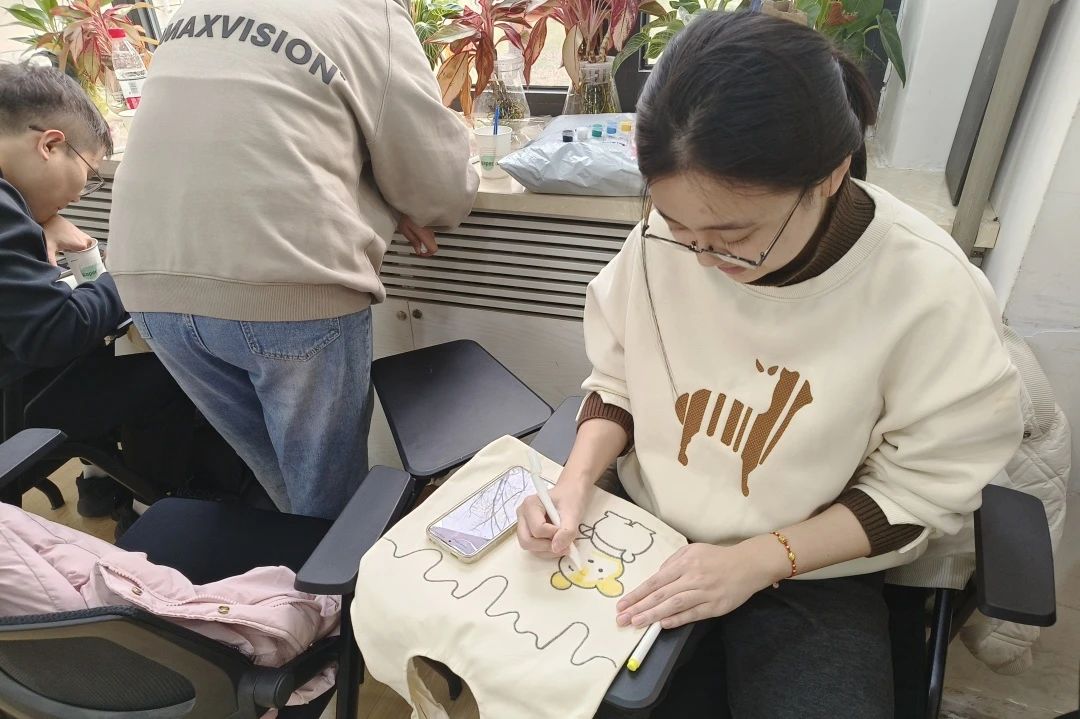 活动现场,学生们手持画笔,在空白的帆布包上挥洒着自己的创意与想象。从简单的线条到复杂的图案,从鲜艳的色彩到内敛的色调,每一件作品都是创作者内心世界的映射,展现了他们对生活的感悟与思考。通过这种方式引导参与者释放日常学习和生活中的压力、增强自我认知,培养独立思考和创造的能力。
